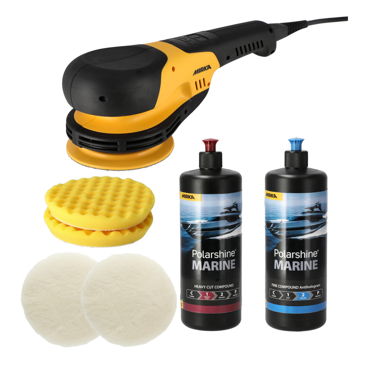 MIRKA POLAROS kampaaniakomplekt on loodud professionaalidele, kes vajavad tõhusat lõiget, kontrollitud tööprotsessi ja kvaliteetset lõppviimistlust. Komplekt ühendab endas Mirka Marine poleerpastad, POLAROS poleerimisalustalla ning spetsiaalselt valitud poleerimispadjad, moodustades loogilise ja efektiivse mitmeetapilise poleerimissüsteemi.
